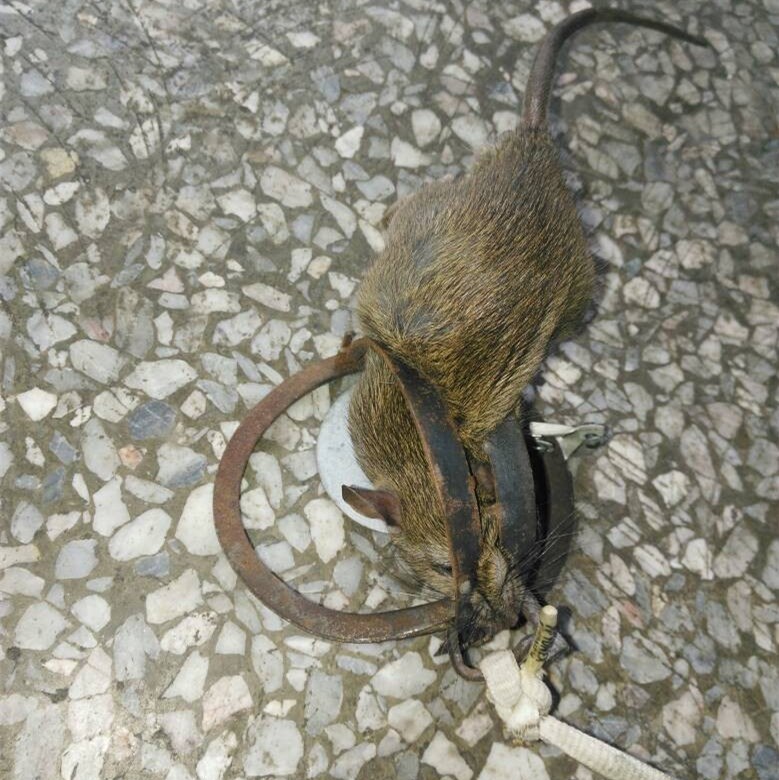 (3)放夾時(shí)要注意自身安全,壓簧桿掛上之后,手始終不要接觸前端(夾老鼠的那端)。鼠夾放好后不得有人在現(xiàn)場(chǎng)走動(dòng),鼠夾要晚放晨收,專(zhuān)人負(fù)責(zé)。在可能情況下,捕到老鼠后馬上重新放置。收夾時(shí)最好拿根棍子敲擊未捕到鼠、上弦待發(fā)的夾子,使壓簧桿復(fù)位后再用手撿。